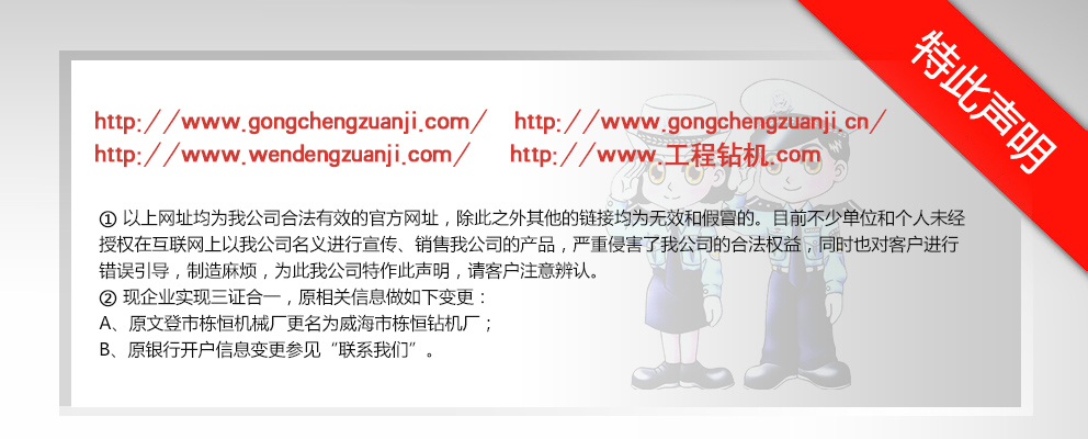 威海市棟恒鉆機廠隸屬于文登市工程鉆機廠,主要生產(chǎn)、銷售工程鉆機。它坐落于文登市西鋪頭工業(yè)園,這里科技發(fā)達,交通便利,制造業(yè)集中。 自1982年建廠以來,經(jīng)過多年的優(yōu)化改革和沉淀積累,擁有精密、大型加工設(shè)備近百臺的生產(chǎn)企業(yè)之一。現(xiàn)在研制成功的GJ-400、GJ-250S、GJ-250A、GJ-240S、GJ-240A、GJ-180S、GJ-180A型等鉆機。在其它產(chǎn)品上,企業(yè)建立了長期、中期、短期的發(fā)展規(guī)劃,一系列的高性能產(chǎn)品正在不斷推出中,企業(yè)應(yīng)市場需求對系列產(chǎn)品進行了優(yōu)化組合,開發(fā)了與之對應(yīng)配套的三腿、四腿單天車輪、雙天車輪鉆塔;泥漿泵—BW-160Q、BW- 200Q型球形閥泥漿泵大大提高了泵的使用性能和機械效率